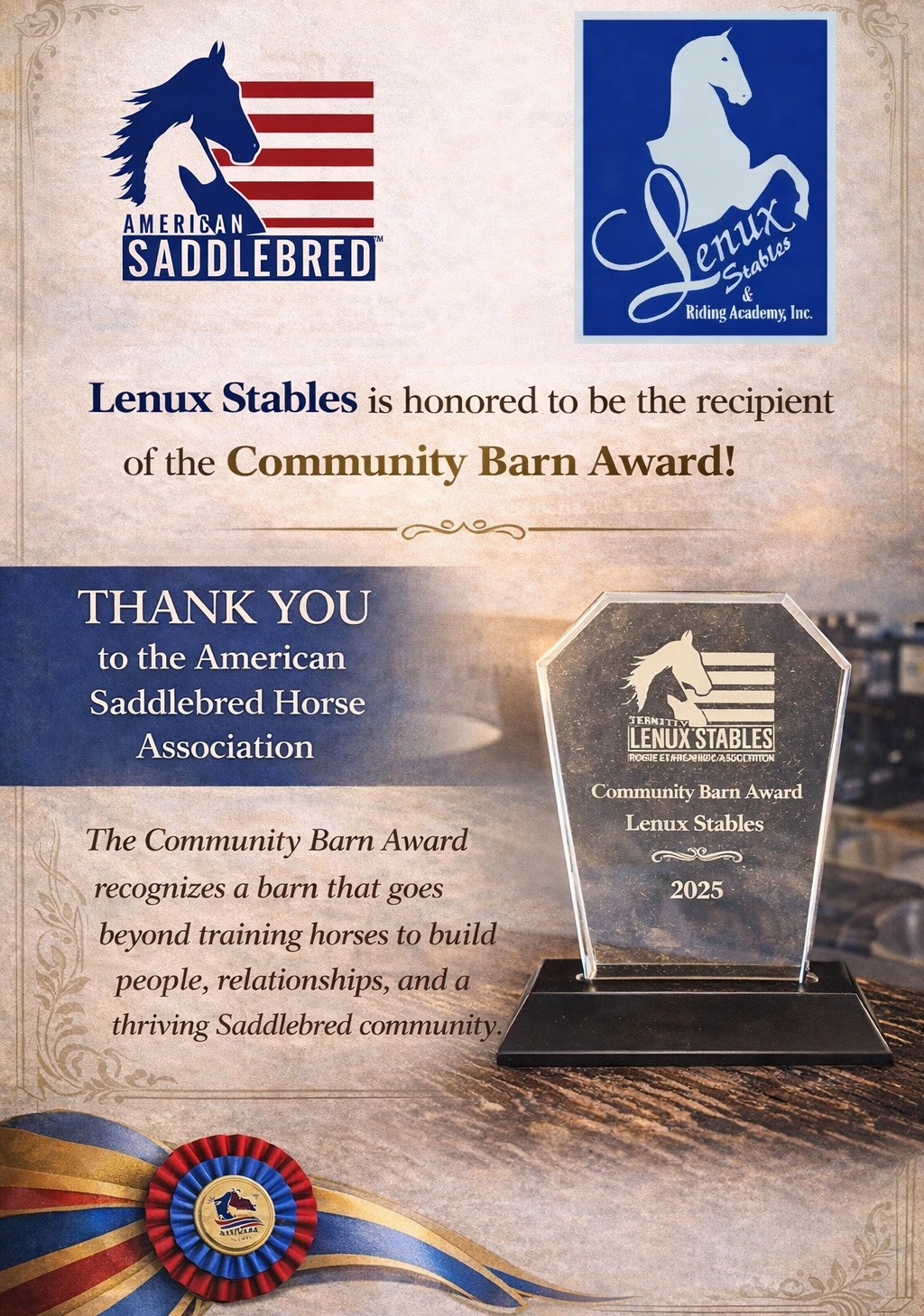 February 23, 2026: Lexington, KY – The American Saddlebred Horse & Breeders Association (ASHBA) proudly recognized Lenux Stables as the recipient of the 2025 Community Barn Award, presented at the Saddlebred Celebrations Luncheon during the 2026 ASHBA Annual Convention.