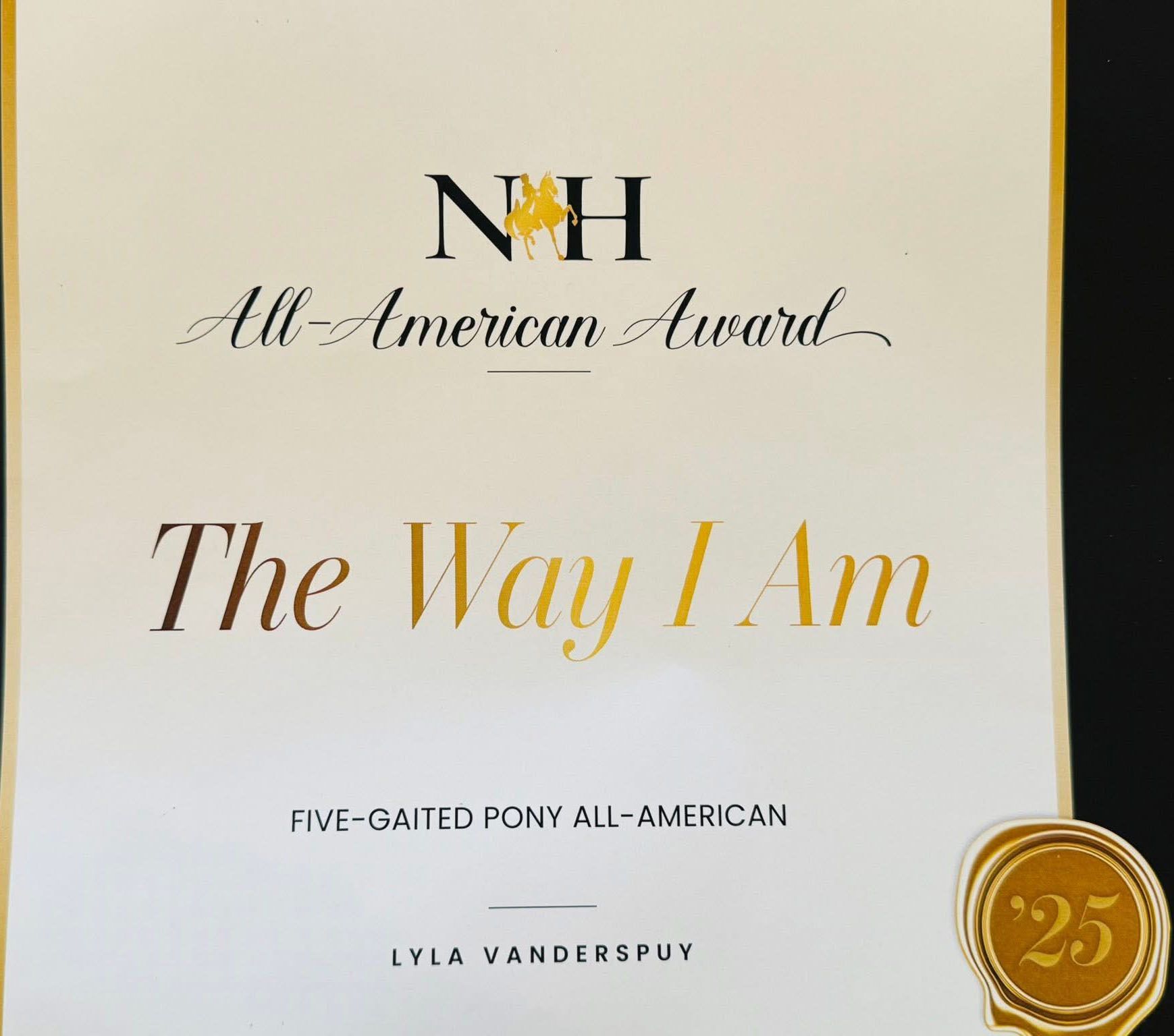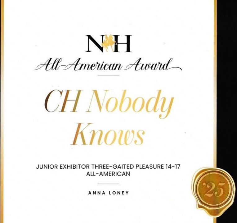 Congratulations to WCC WC CH Nobody Knows and Anna Loney (above) on being named a 2025 National Horseman Junior Exhibitor Three-Gaited Show Pleasure 14-17 All-American and ASAC Junior Exhibitor Three-Gaited Pleasure High Point Grand Champions for 2025. Congratulations also go to The Way I Am and Lyla VanderSpuy (below) on being named a 2025 National Horseman Five-Gaited Pony All-American and ASAC Five-Gatied Pony High Point Grand Champions for 2025.